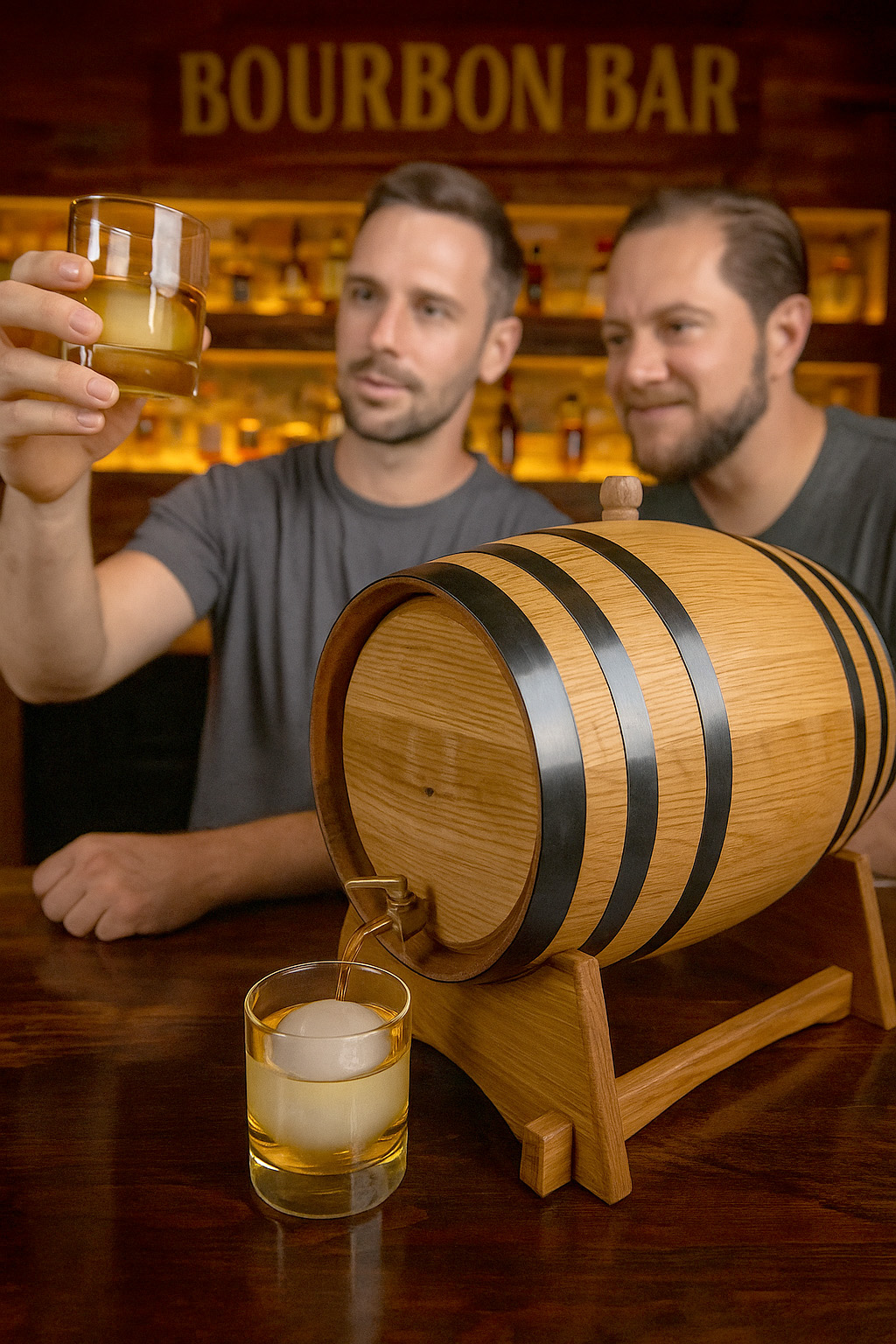 Every barrel arrives with a sturdy wooden stand, a tight-sealing bung, and a polished brass spigot that makes every pour feel like a special occasion. Whether you set it up as a tabletop oak barrel dispenser or use it for serious home aging, it instantly becomes the centerpiece of any home bar.