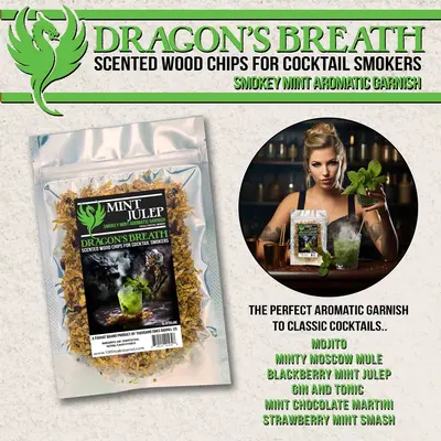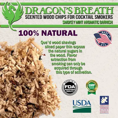 - Unique Flavor Infusion - Dragon's Breath cocktail smoking chips are infused with a variety of flavors including Absynthe, Blood Orange, Tangerine Tango, Mint Julep, Lemon Bliss, and Cinnamon Amira, adding a unique and flavorful accent to your smoked cocktails. These finely shaved wood chips are perfect for a whiskey smoker, bourbon smoker, cocktail smoker, or even a meat smoker. They can be used with a smoking chamber, smoking gun, glass top smokers, smoking domes or smoking cloche.