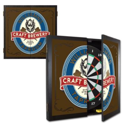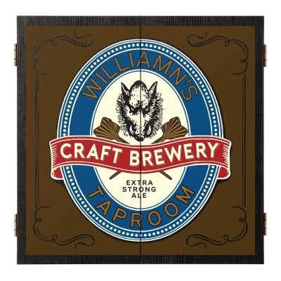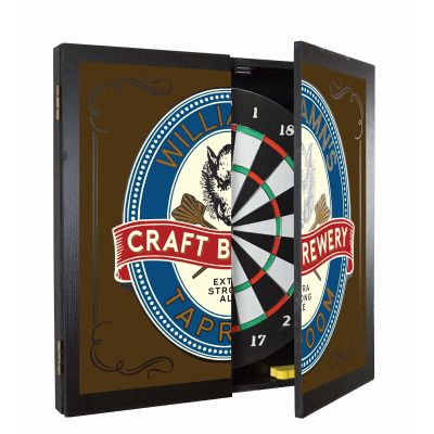 Personalized dartboard and cabinet set! This personalized cabinet will complete the look of any game room with a classic matte black traditional finish with a personalized graphic. Don't leave your wall unprotected from errant throws! The cabinet has a coated finish meant to absorb the toughest of impacts. The sharp, sleek design will complement most decors and will ensure that your dartboard doesn't clash with your style.