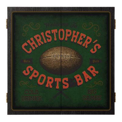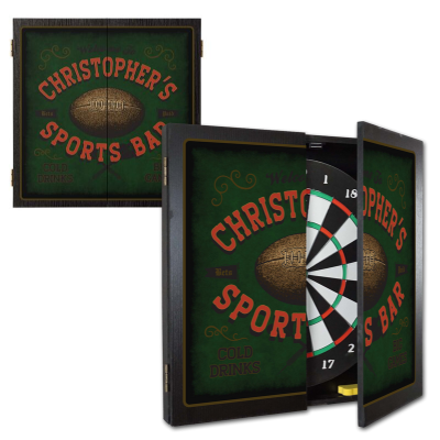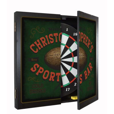 Personalized dartboard and cabinet set! This personalized cabinet will complete the look of any game room with a classic matte black traditional finish with a personalized graphic. Don't leave your wall unprotected from errant throws! The cabinet has a coated finish meant to absorb the toughest of impacts. The sharp, sleek design will complement most decors and will ensure that your dartboard doesn't clash with your style.