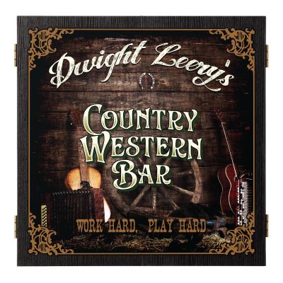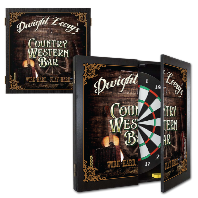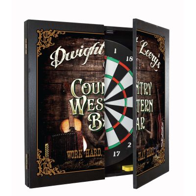 Personalized dartboard and cabinet set! This personalized cabinet will complete the look of any game room with a classic matte black traditional finish with a personalized graphic. Don't leave your wall unprotected from errant throws! The cabinet has a coated finish meant to absorb the toughest of impacts. The sharp, sleek design will complement most decors and will ensure that your dartboard doesn't clash with your style.