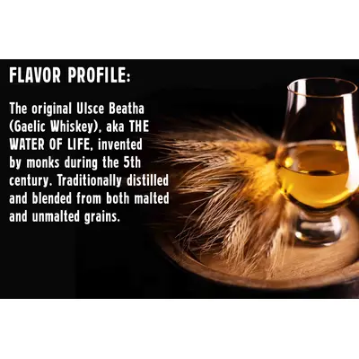 20ml packet of Blended Barley Essence Essence. The original Ulsce Beatha (Gaelic Whiskey), aka THE WATER OF LIFE, invented by monks during the 5th century. Traditionally distilled and blended from both malted and unmalted grains.