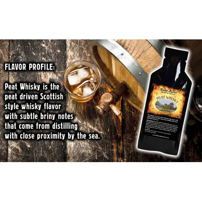 20ml packet of Peat Whisky Essence. Peat Whisky is the peat drivin Scottish style whisky flavor with subtle briny notes that come from distilling with close proxinity by the sea,.