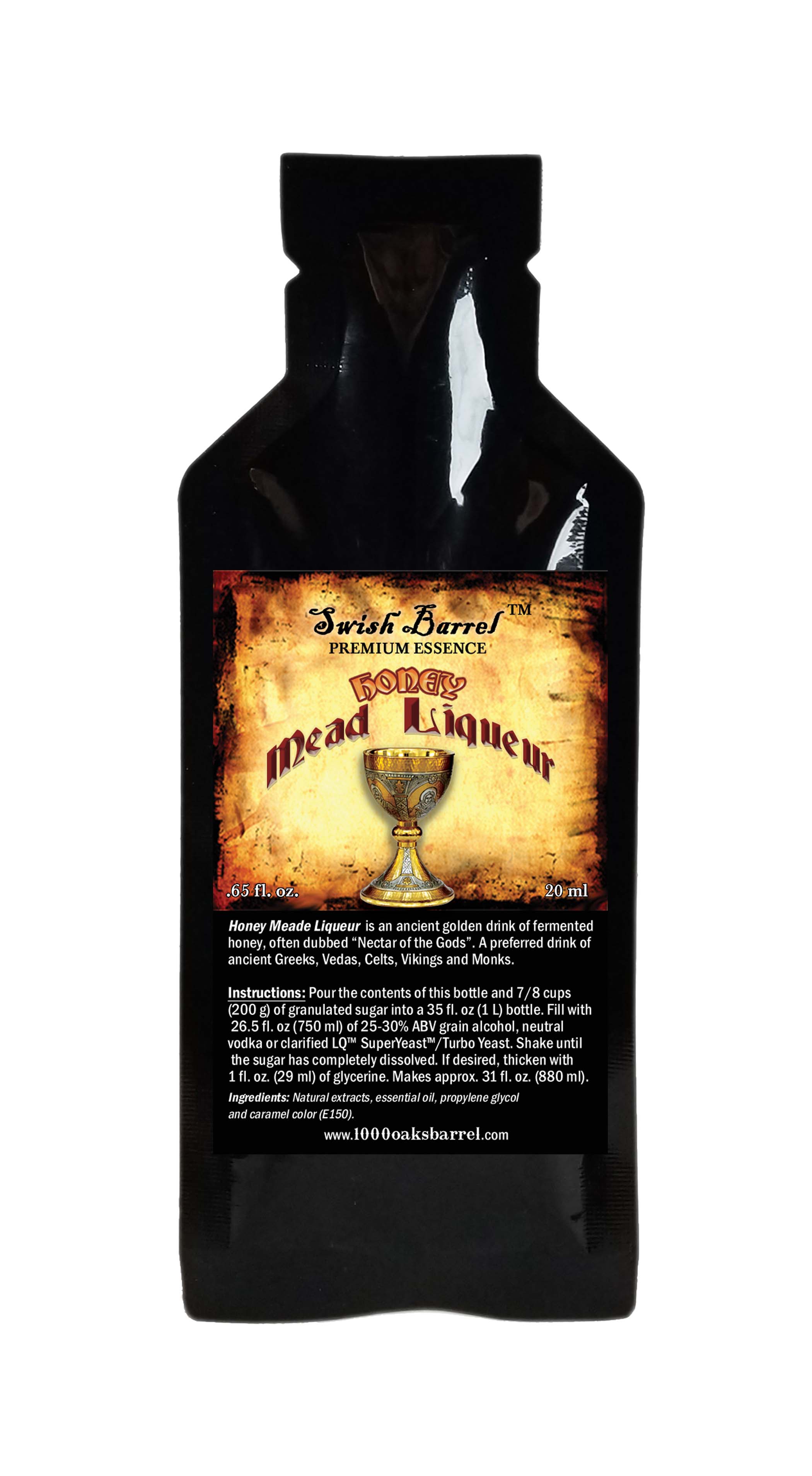 Instructions: Pour the contents of the packet and 1/2 cup of granulated suger into a barrel or (750ml) bottle. Fill with 26 oz of 40% alc./volume grain alcohol, neutral vodka, moonshine, or swish barrel alcohol. Shake well to mix thoroughly. Makes 26 fl. oz. (750 mL). For barrels larger than 1 liter, use 1 bottle of Mead essence per liter of alcohol.