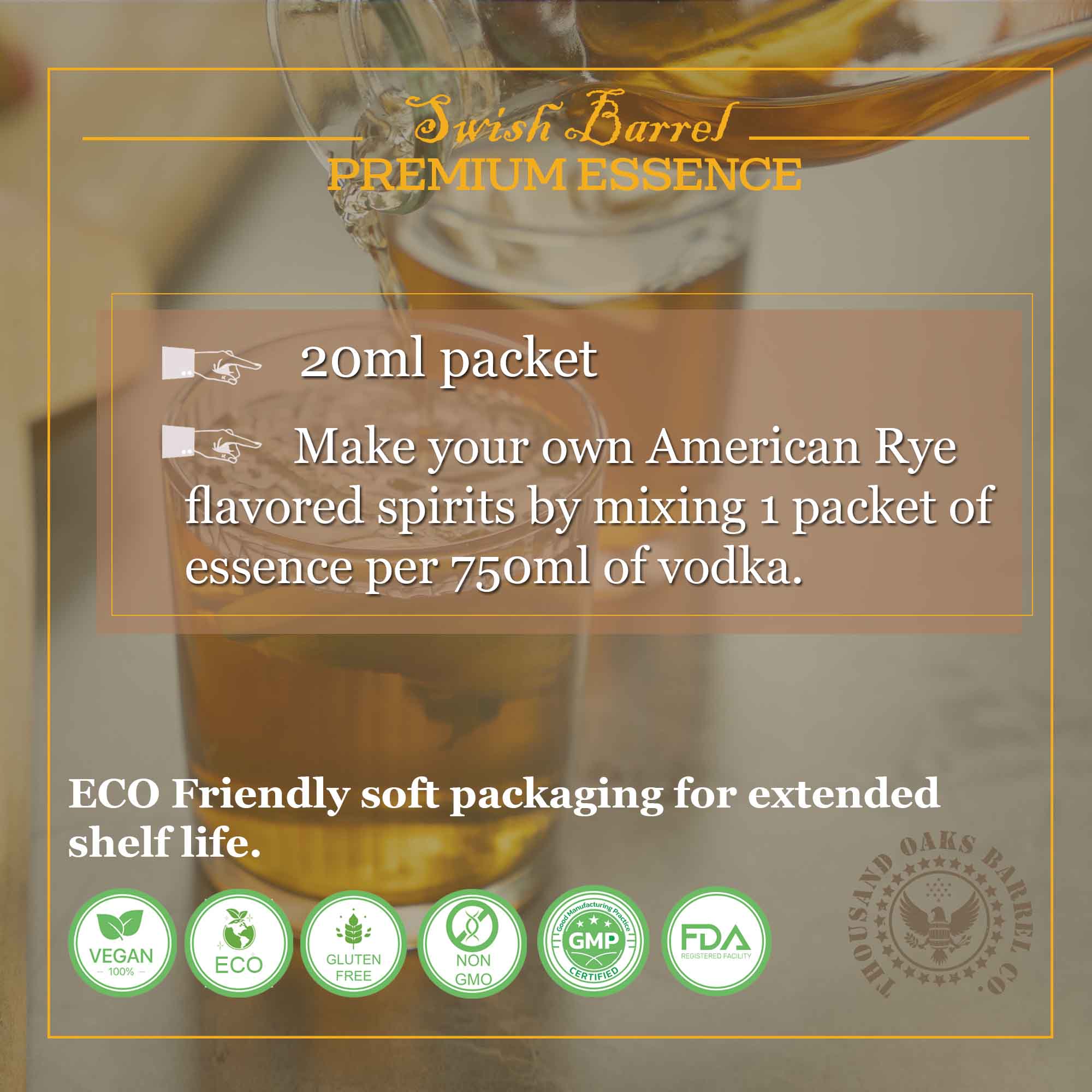 - Add 1 full 20ml packet of American Rye Whiskey Essence.