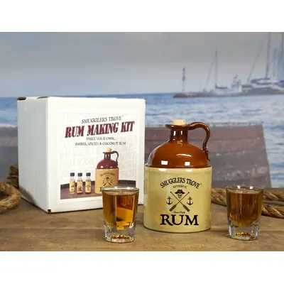 Smuggler's Trove® Rum Making Kit. Whether your pirate, sailor or simple landlubber, now you can make your own rum at home with the Smuggler's Trove® Rum Making Kit. Kit includes a rum jug and essence to make Coconut Rum, Spiced Rum, and Amber Caribbean Rum. How does it work? Mix vodka, moonshine or grain spirit (not included) with a bottle of essence. Add sugar (see essence bottle for quantities ) and your favorite spices to flavor to taste. Shake well. SWIG AS NEEDED!