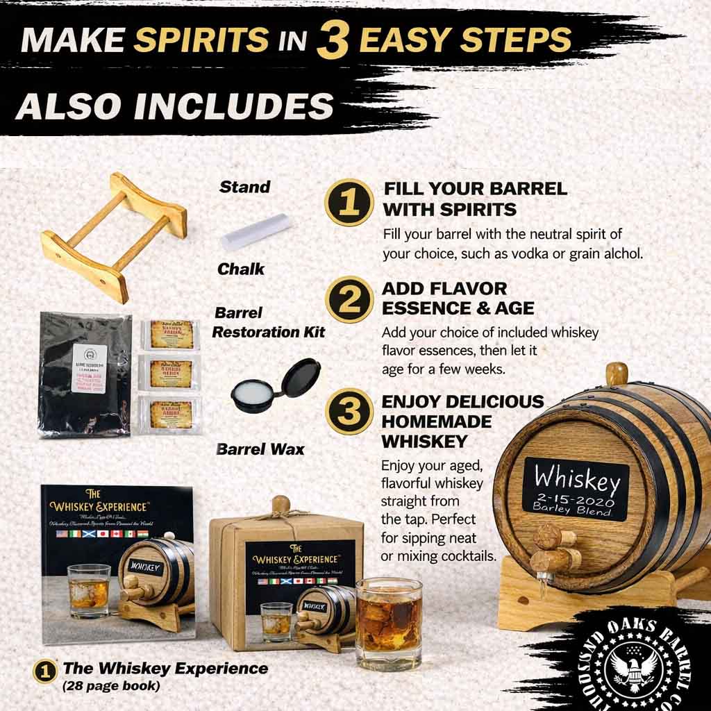 The Whiskey Experience™ Whiskey Making Kit is a professional-grade oak barrel aging kit designed for home bartenders, whiskey enthusiasts, craft spirit lovers, and gift buyers looking for a premium DIY whiskey kit.