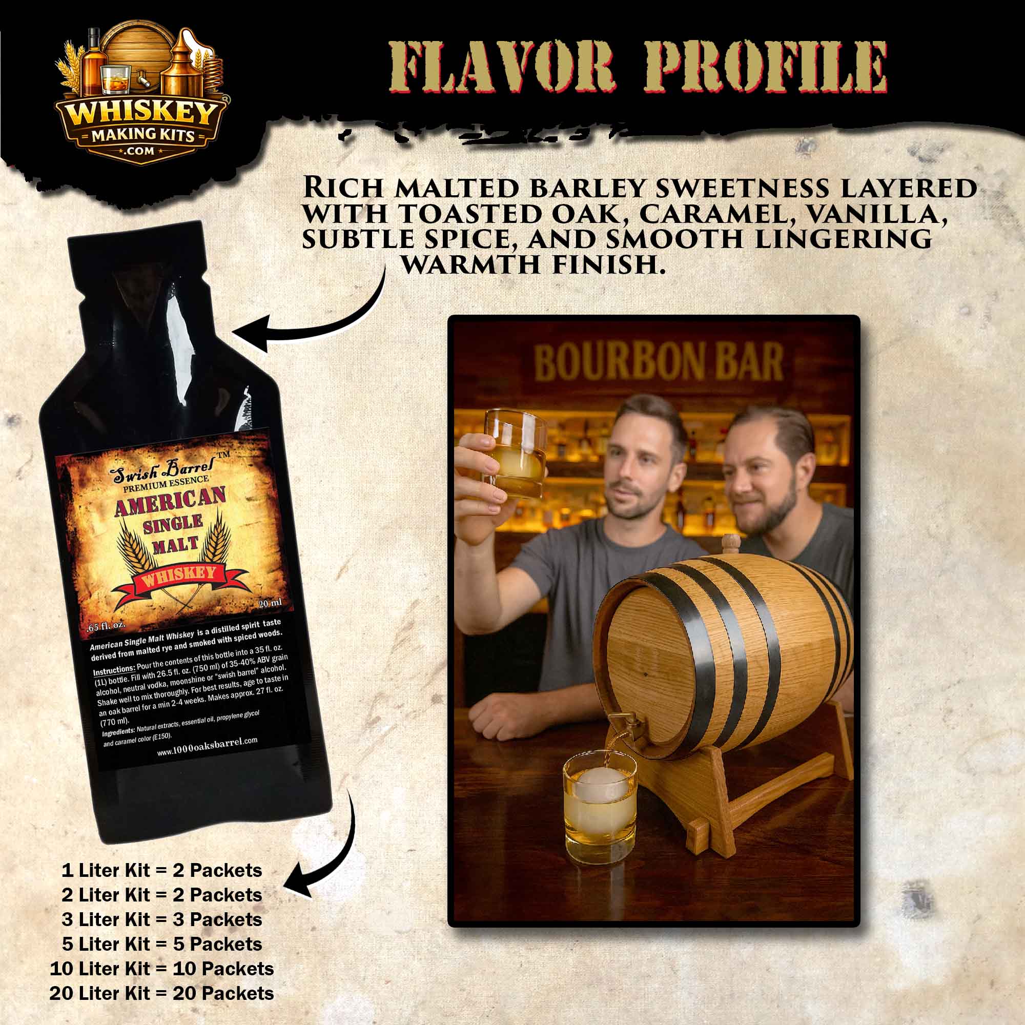 This kit recreates that authentic American single malt flavor profile using real oak barrel aging combined with premium essence concentrate.