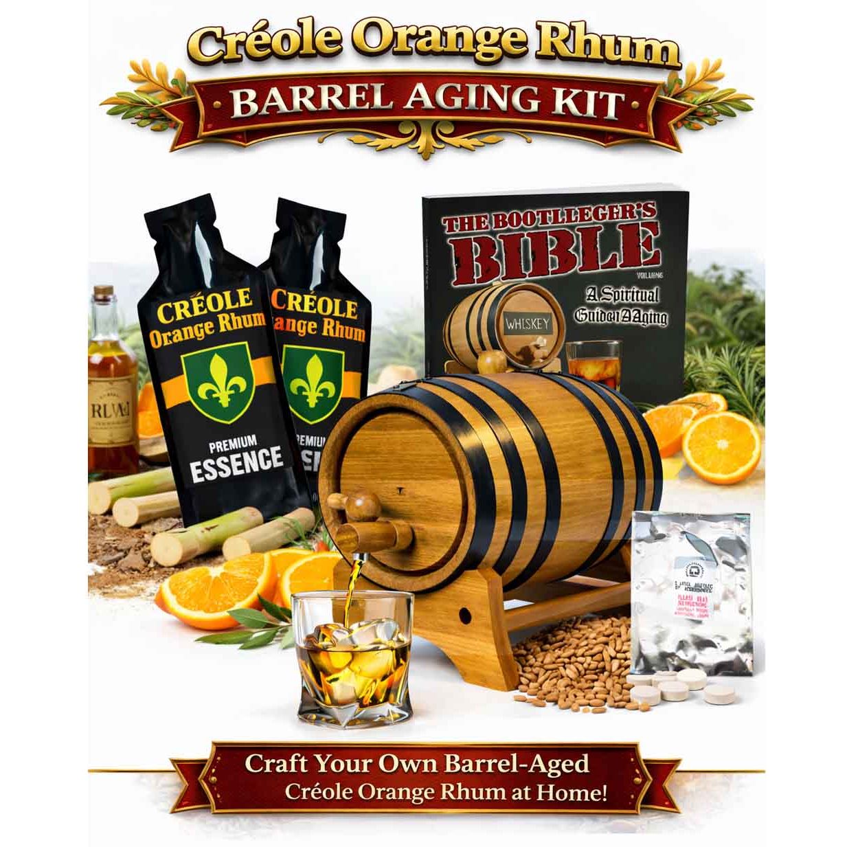 Experience the bold character and tropical elegance of the Caribbean with the Créole Orange Rhum Barrel Aging Kit™ — a complete home rum making and barrel aging system designed for enthusiasts who want to craft premium small-batch orange rum with authentic oak-aged complexity.