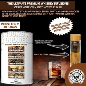 Premium whiskey infusion kit with glass infuser bottle and stainless steel cage showing three infusion flavors for DIY bourbon making.