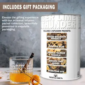 Five Liquor Quik® infusion packets including Spiced Bourbon, Tropical Thunder Tequila, Trinidad Rum, Ginger Lime Vodka, and Gemstone Gin.