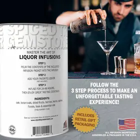 Liquor Quik Vodka Infusion Kit showing 3-step infusion process and retail gift packaging on bar counter