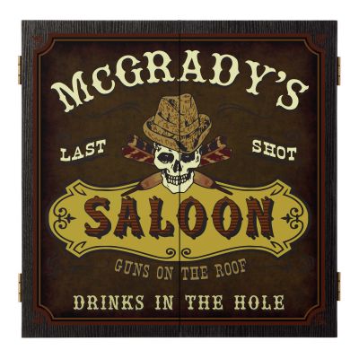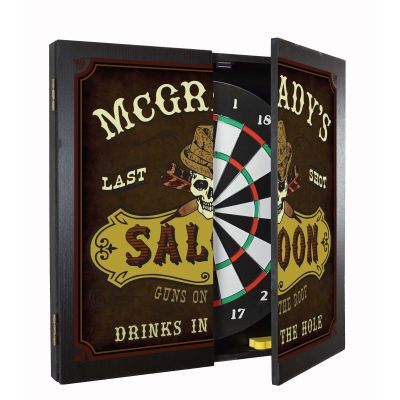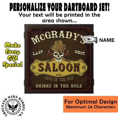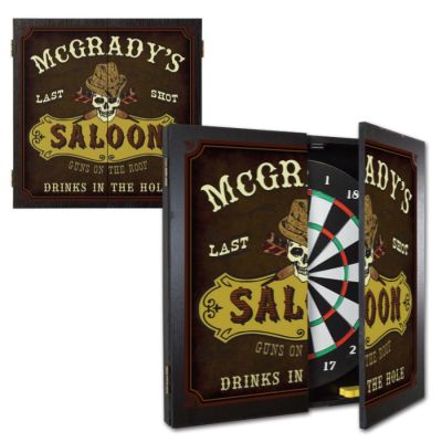 Personalized dartboard and cabinet set! This personalized cabinet will complete the look of any game room with a classic matte black traditional finish with a personalized graphic. Don't leave your wall unprotected from errant throws! The cabinet has a coated finish meant to absorb the toughest of impacts. The sharp, sleek design will complement most decors and will ensure that your dartboard doesn't clash with your style.