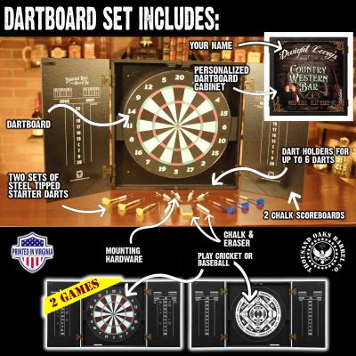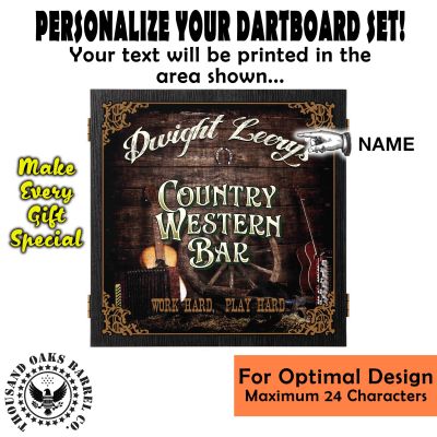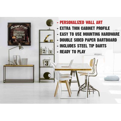 Personalized dartboard and cabinet set! This personalized cabinet will complete the look of any game room with a classic matte black traditional finish with a personalized graphic. Don't leave your wall unprotected from errant throws! The cabinet has a coated finish meant to absorb the toughest of impacts. The sharp, sleek design will complement most decors and will ensure that your dartboard doesn't clash with your style.