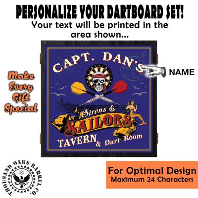 Personalized dartboard and cabinet set! This personalized cabinet will complete the look of any game room with a classic matte black traditional finish with a personalized graphic. Don't leave your wall unprotected from errant throws! The cabinet has a coated finish meant to absorb the toughest of impacts. The sharp, sleek design will complement most decors and will ensure that your dartboard doesn't clash with your style.