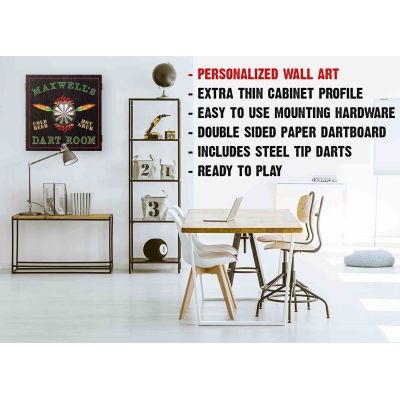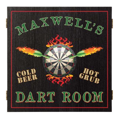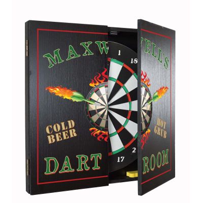 Personalized dartboard and cabinet set! This personalized cabinet will complete the look of any game room with a classic matte black traditional finish with a personalized graphic. Don't leave your wall unprotected from errant throws! The cabinet has a coated finish meant to absorb the toughest of impacts. The sharp, sleek design will complement most decors and will ensure that your dartboard doesn't clash with your style.