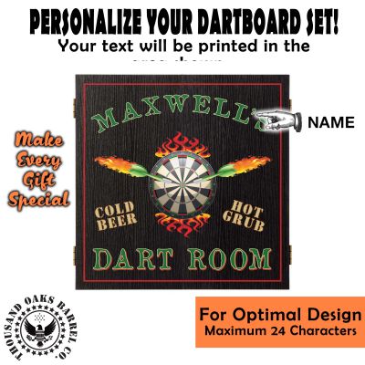 Personalized dartboard and cabinet set! This personalized cabinet will complete the look of any game room with a classic matte black traditional finish with a personalized graphic. Don't leave your wall unprotected from errant throws! The cabinet has a coated finish meant to absorb the toughest of impacts. The sharp, sleek design will complement most decors and will ensure that your dartboard doesn't clash with your style.