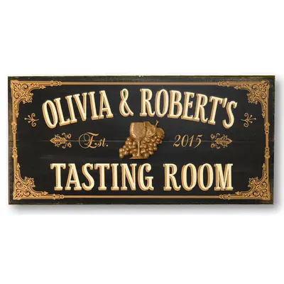 Personalized Pop Art vintage wooden plank sign with sculpted relief. Handcrafted by the Thousand Oaks Barrel Co. in Manassas, Virginia of furniture grade wood planks and professionally printed using proprietary Poly-Arch Lithography. Each 'sign art' piece is individually made upon order. From cutting and preparing the plank, to painting, screening, hand lettering, and distressing, each is a unique piece of art. The sculpted relief is made entirely in-house by staff artisans.