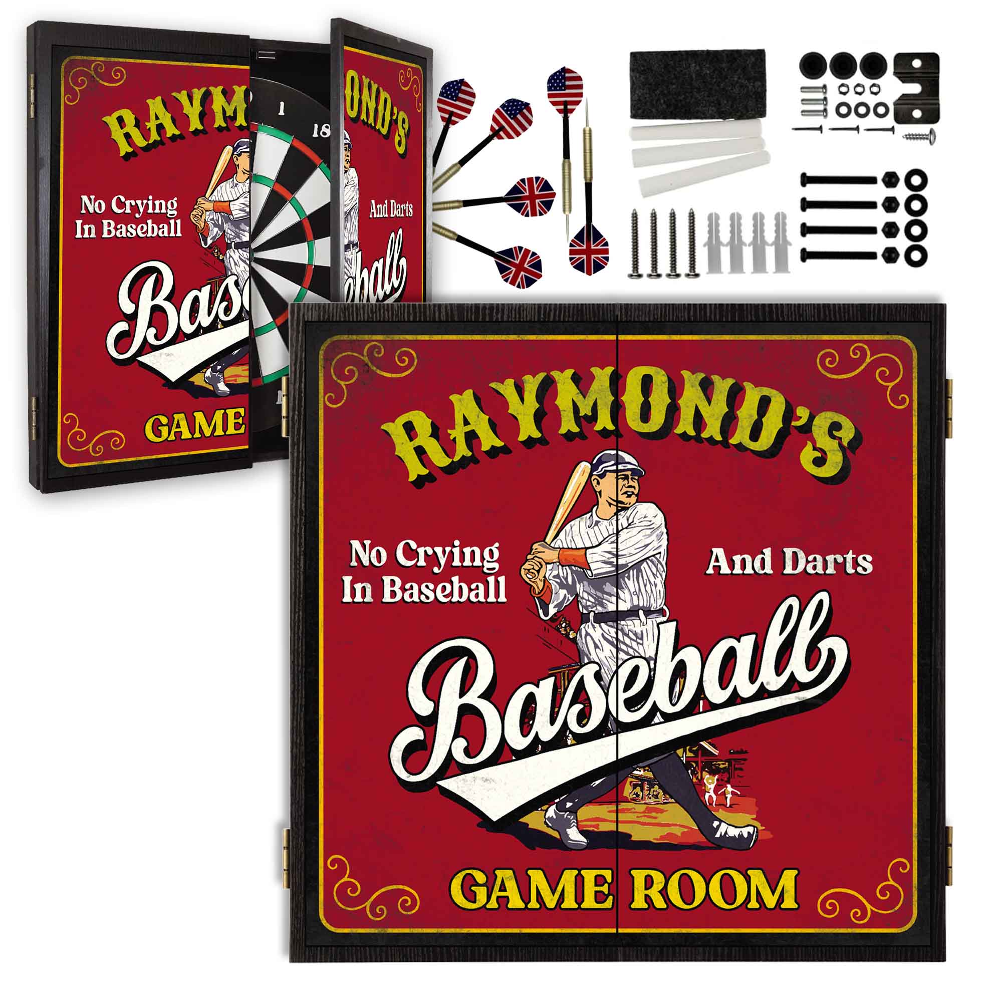 Bring classic Americana and family fun together with this personalized baseball dartboard cabinet set, designed to transform any game room, man cave, basement, bar, or family space into an interactive entertainment hub. Featuring a bold vintage baseball design and custom name personalization, this dartboard cabinet becomes a one-of-a-kind centerpiece that’s both decorative and functional.