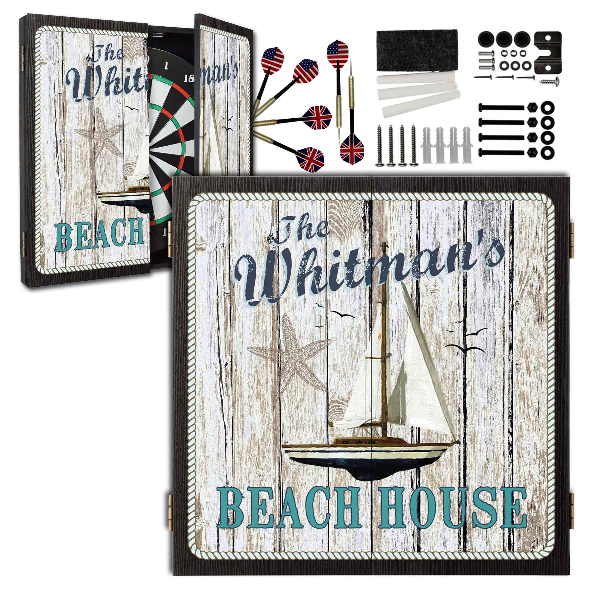 Bring laid-back coastal style and competitive fun together with this Personalized Beach House Dartboard Cabinet Set. Designed with a weathered wood look, sailboat artwork, and nautical accents, this dartboard cabinet is fully customizable with your chosen name—making it a standout addition to any beach house, game room, bar, or vacation rental.