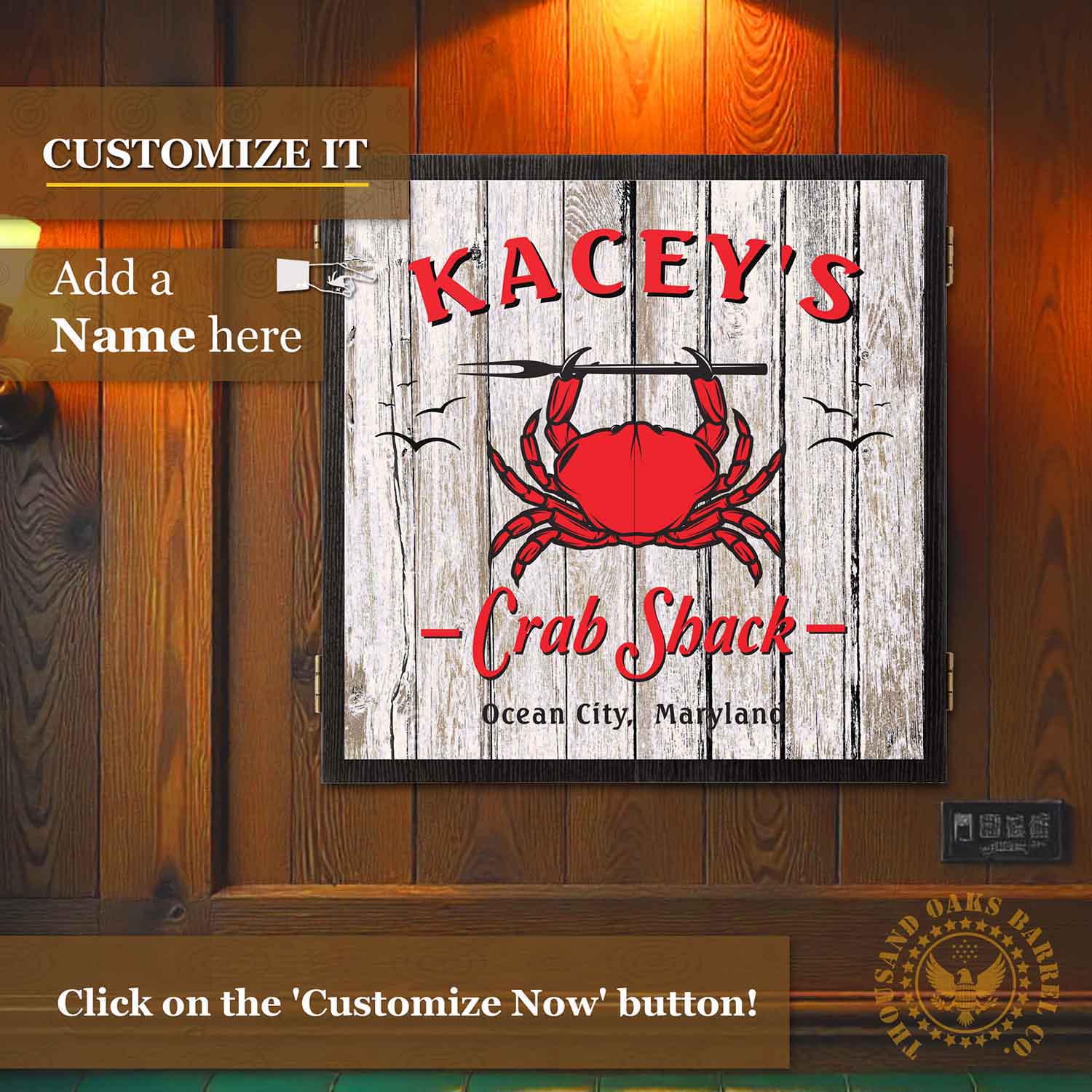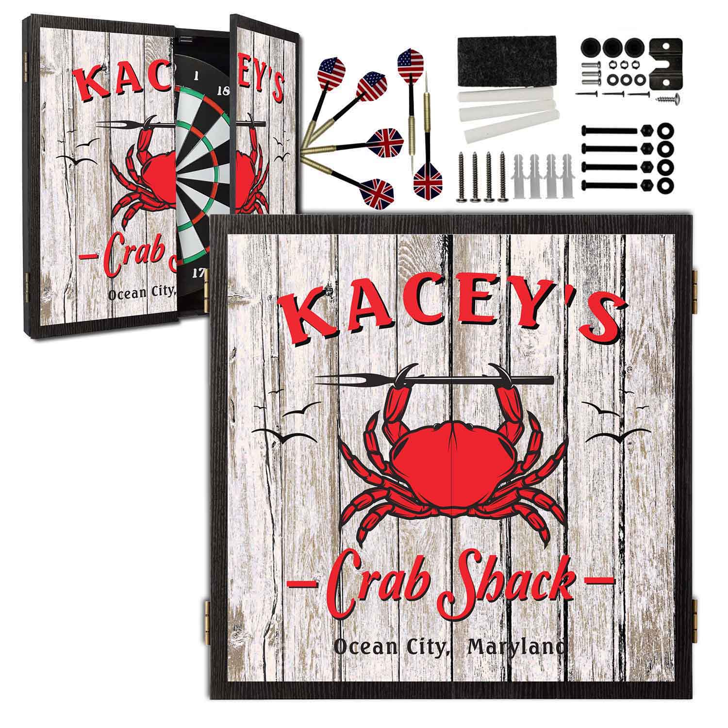 Add coastal charm and laid-back fun to your space with this Personalized Crab Shack Dartboard Cabinet Set. Featuring a rustic wood-plank background, bold red crab artwork, and classic seaside styling, this cabinet is customized with your name or family name, making it a truly one-of-a-kind game room centerpiece.