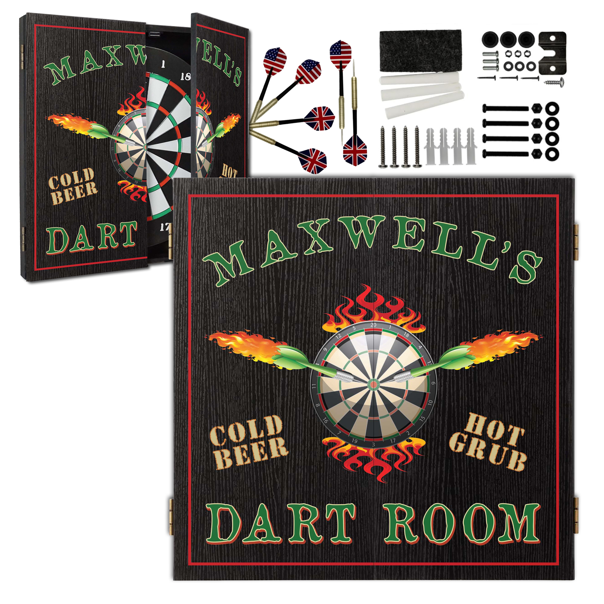 Turn your game space into the ultimate hangout with this Personalized Dart Room Dartboard Cabinet Set. Featuring a bold fire-and-flames design with crossed darts, rustic wood styling, and custom name personalization, this cabinet is made to stand out as the centerpiece of any man cave, bar area, or game room.