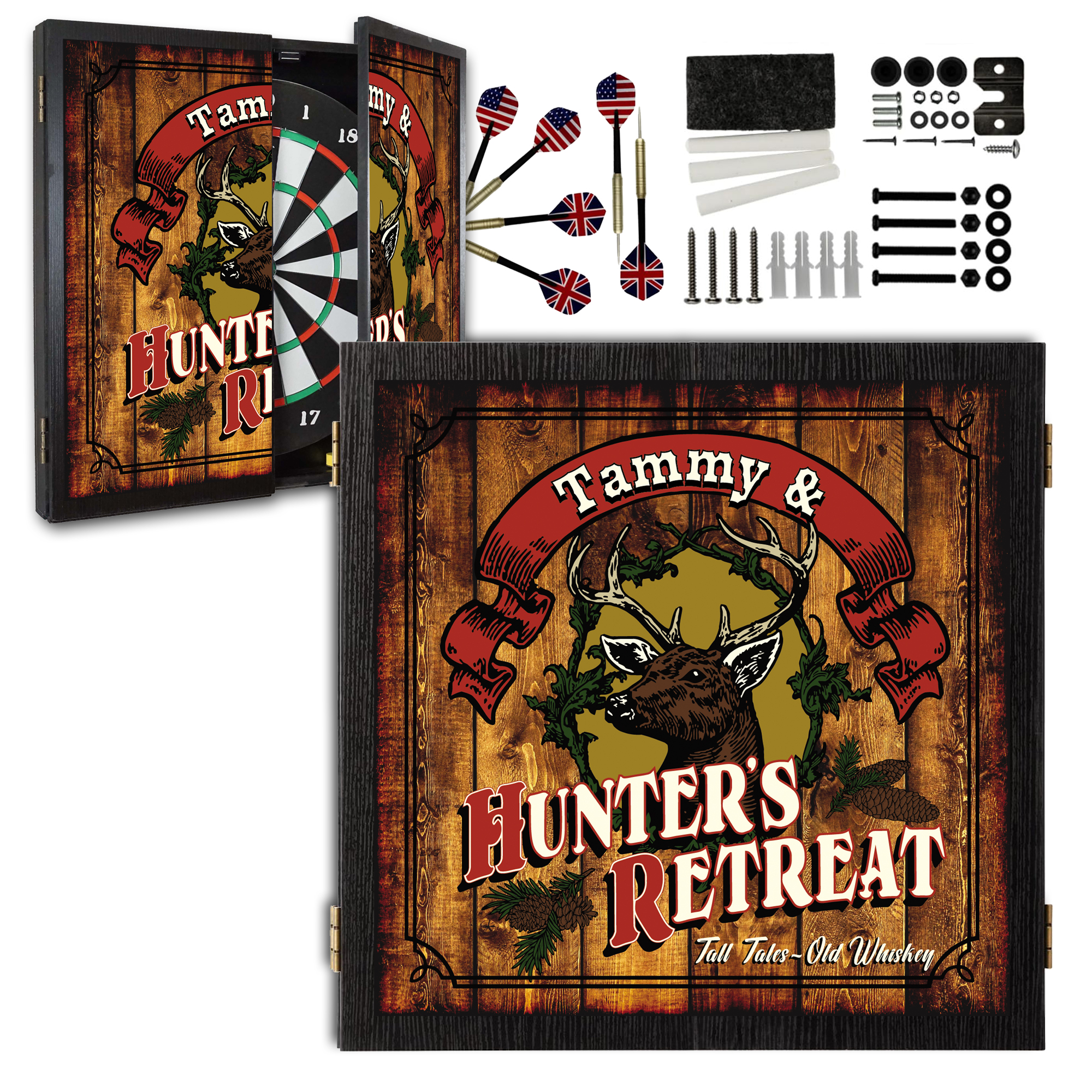 Bring the spirit of the outdoors into your home with our Personalized Hunter’s Retreat Dartboard Cabinet Set, a custom name deer hunting dart board designed for rustic cabins, hunting lodges, man caves, and game rooms.