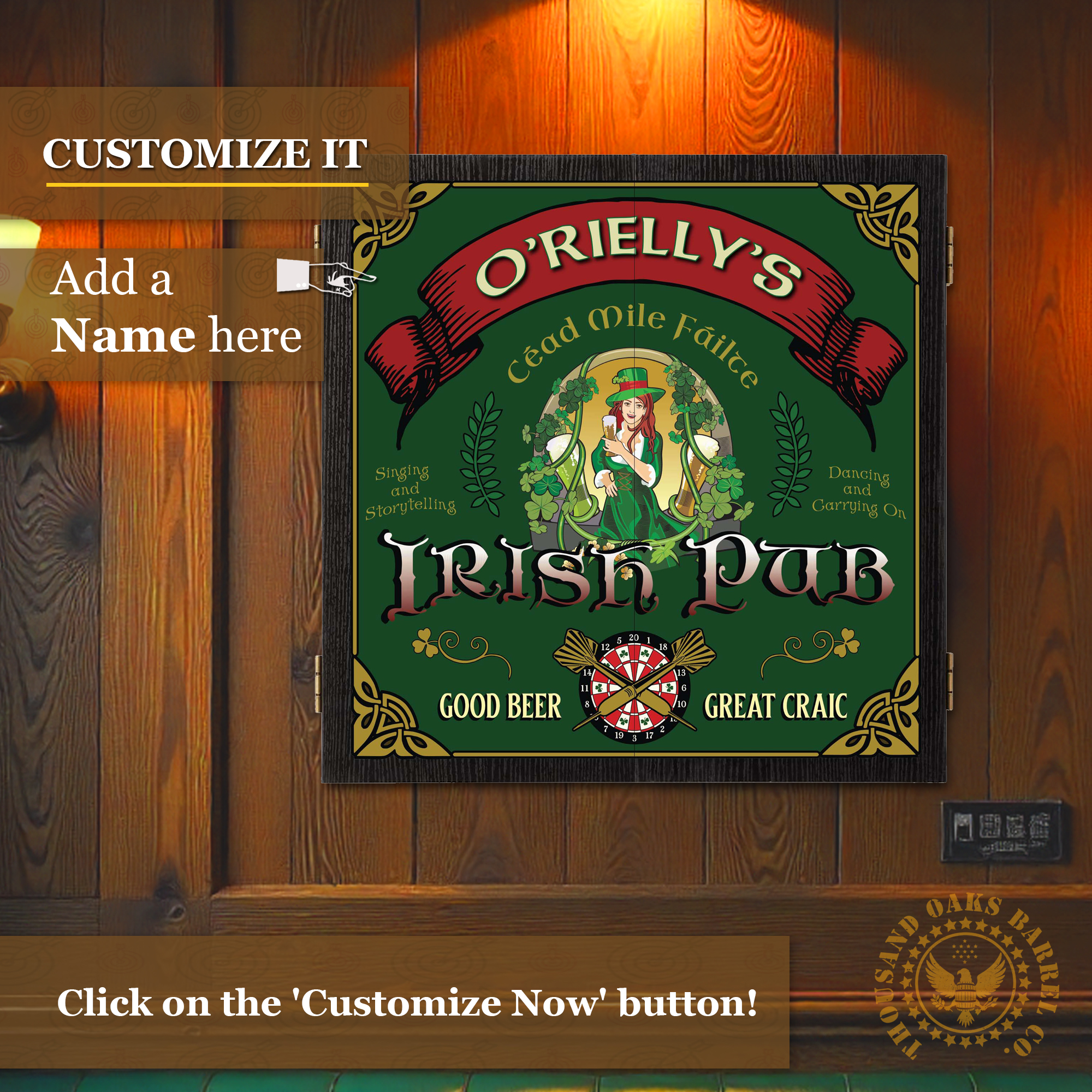 Bring the charm of a traditional Irish pub straight into your home with this Personalized Irish Pub Dartboard Cabinet Set. Designed with rich green tones, Celtic knot accents, and classic pub artwork, this custom dartboard cabinet lets you proudly feature your name or family name as part of the design, creating a one-of-a-kind centerpiece for your game room, man cave, or home bar.