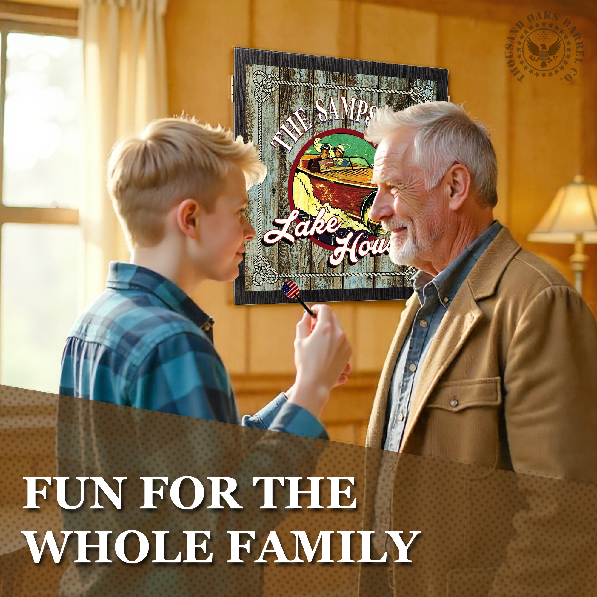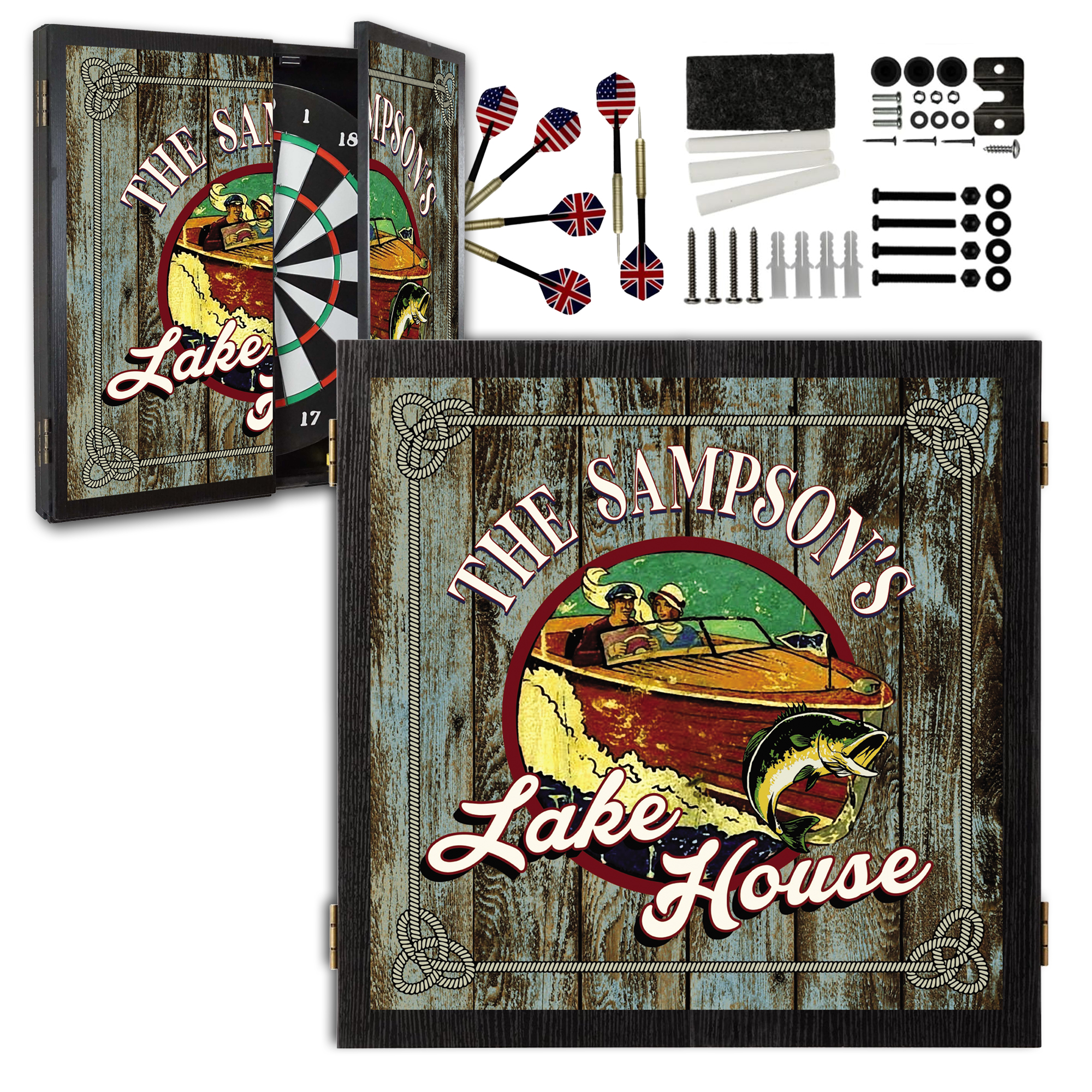 The Personalized Lake House Dartboard Cabinet Set turns those memories into a centerpiece for your cabin, lake house, or game room. Featuring a vintage-inspired boating and fishing design set against rustic wood plank artwork, this custom dartboard cabinet showcases your family name prominently across the front — because the best lake memories belong to someone.