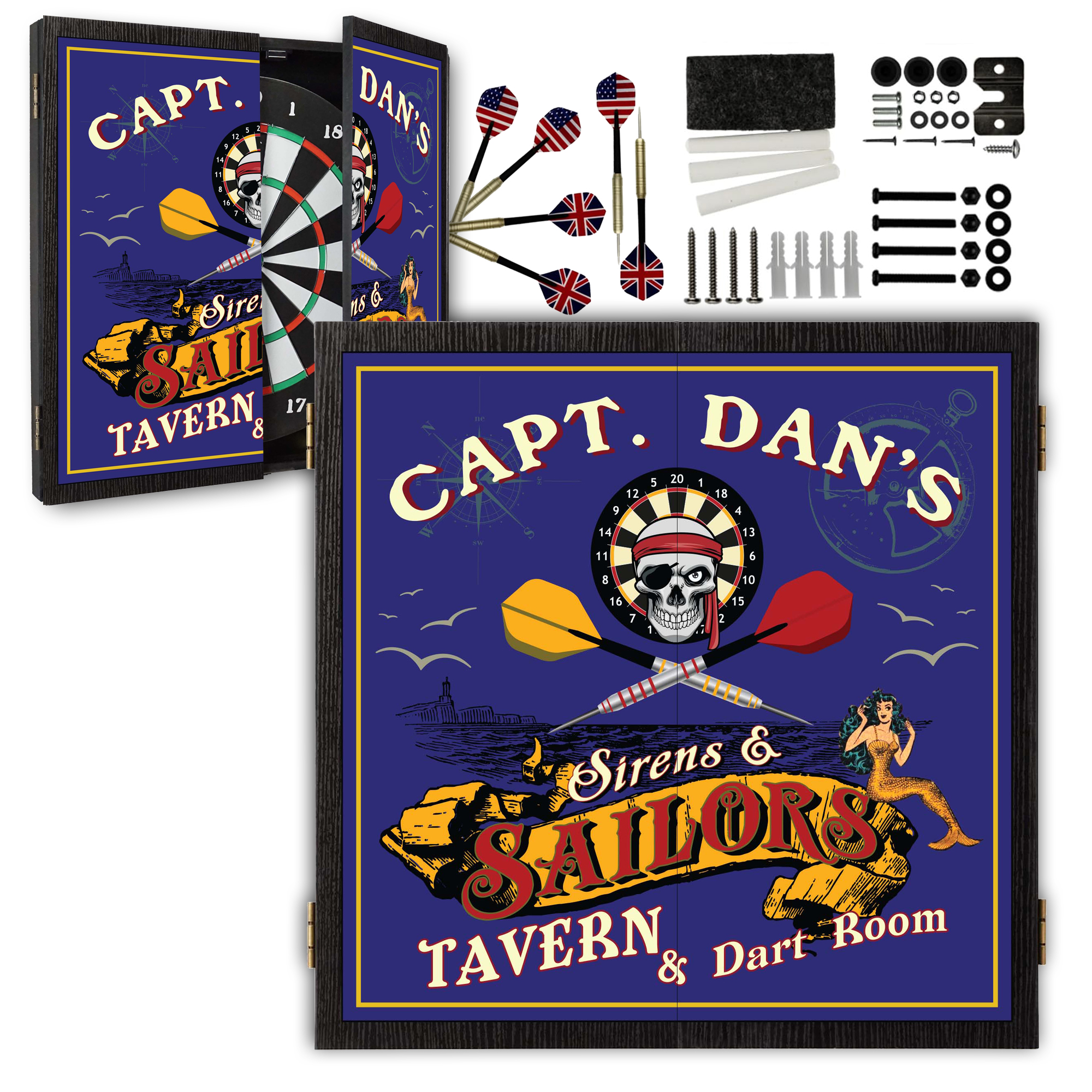 The solid wood cabinet opens to reveal a professional steel-tip dartboard, while the exterior proudly displays your custom name—making it feel like your very own coastal tavern or pirate hideaway. Whether you’re hosting friends or enjoying family game time, this set delivers style, durability, and unforgettable personality.