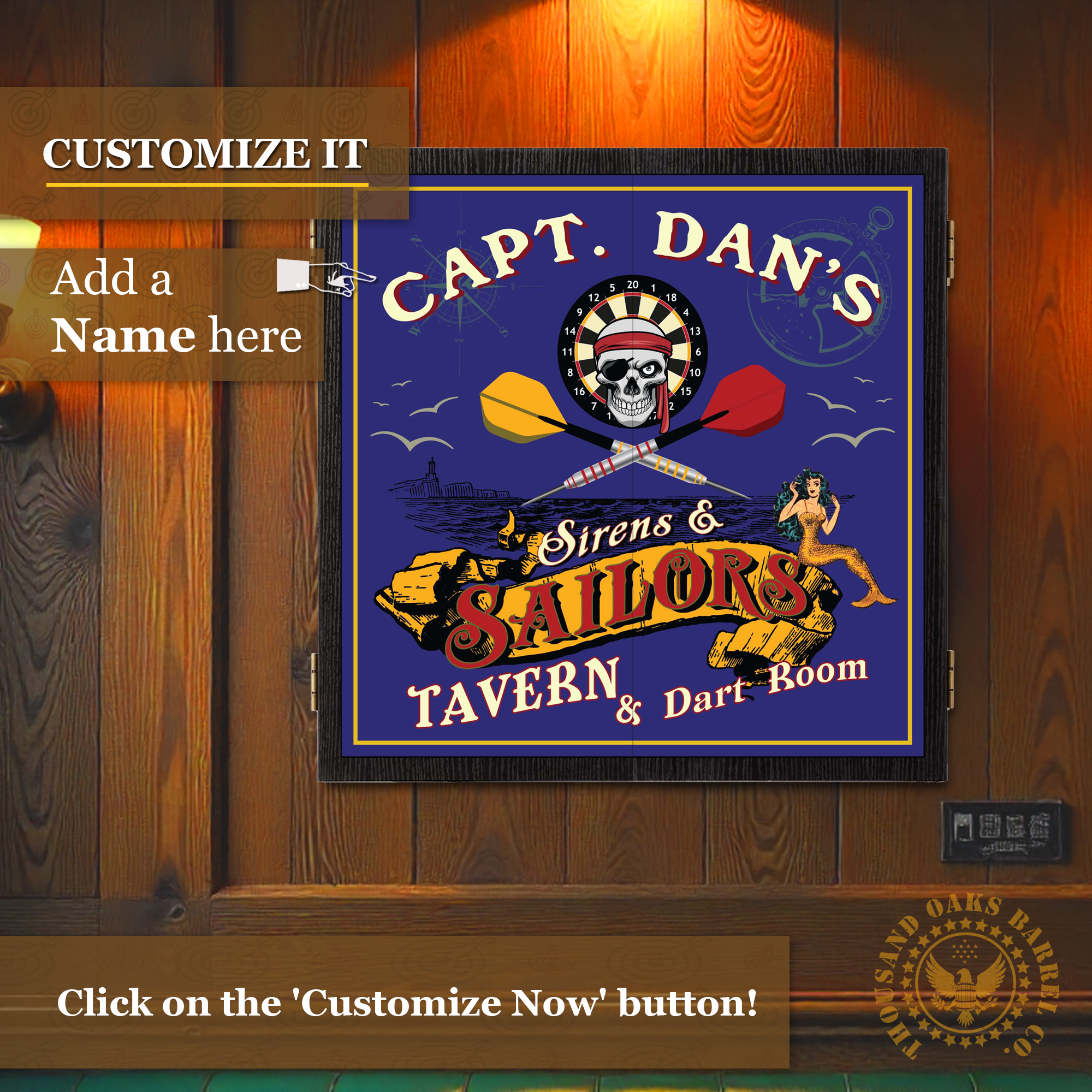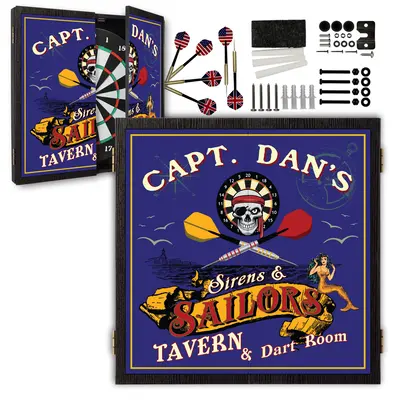 Set sail for legendary game nights with this personalized pirate-themed dartboard cabinet set, custom printed with your name or tavern name for a truly one-of-a-kind look. Inspired by classic nautical taverns and seafaring legends, this design features bold maritime artwork, crossed darts, skull imagery, and vintage sailor accents—perfect for a home bar, game room, man cave, or dart room.