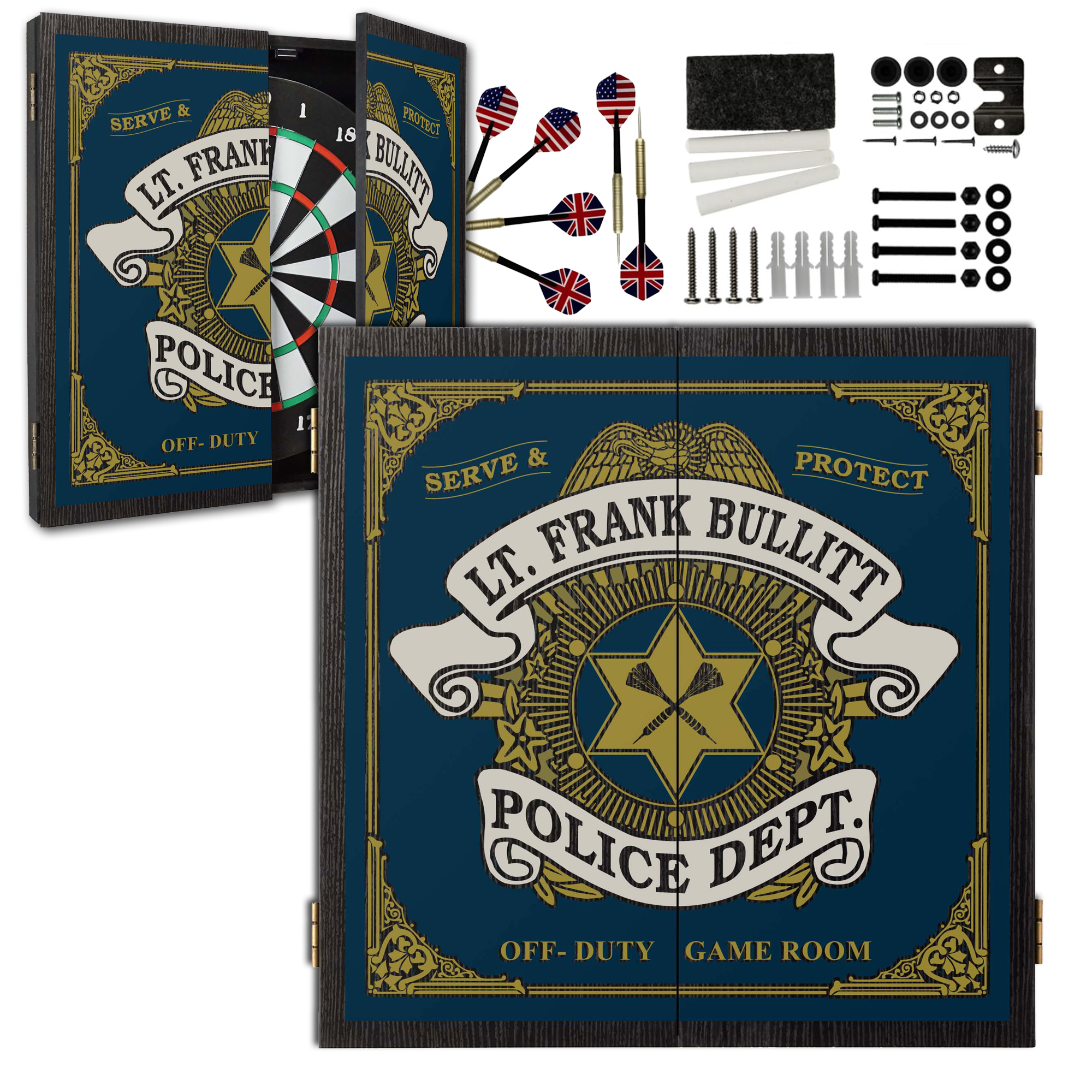 Whether you're gifting a retiring officer, celebrating a promotion, or upgrading your own game room, this personalized dartboard cabinet delivers both pride and play.
