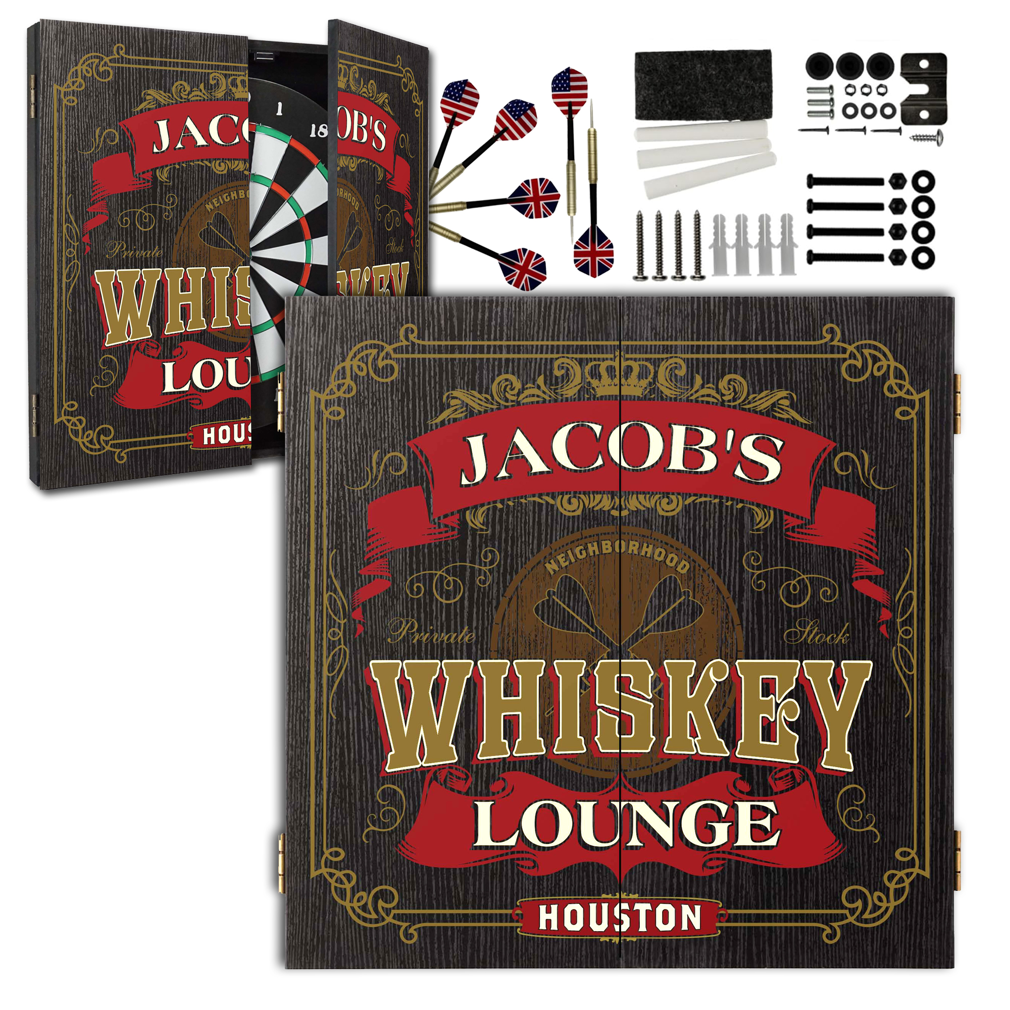 This handcrafted dartboard cabinet features a rich woodgrain finish with vintage-inspired whiskey lounge artwork that can be fully customized with your name, bar name, or business branding. Whether it’s Jacob’s Whiskey Lounge, your family name, or your home bar title, your custom text is professionally printed directly into the design for a premium, built-in look.