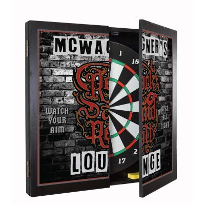 Personalized dartboard and cabinet set! This personalized cabinet will complete the look of any game room with a classic matte black traditional finish with a personalized graphic. Don't leave your wall unprotected from errant throws! The cabinet has a coated finish meant to absorb the toughest of impacts. The sharp, sleek design will complement most decors and will ensure that your dartboard doesn't clash with your style.
