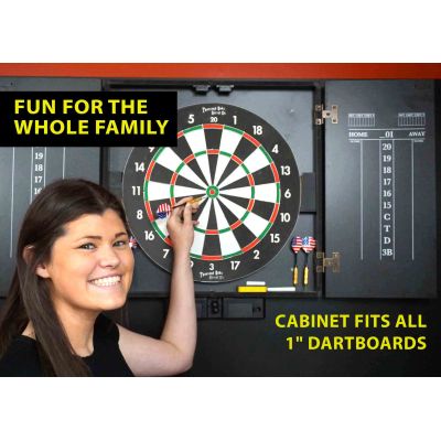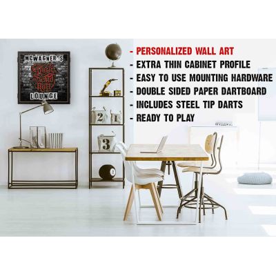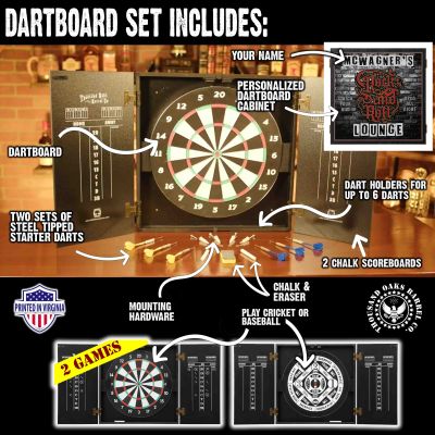 Personalized dartboard and cabinet set! This personalized cabinet will complete the look of any game room with a classic matte black traditional finish with a personalized graphic. Don't leave your wall unprotected from errant throws! The cabinet has a coated finish meant to absorb the toughest of impacts. The sharp, sleek design will complement most decors and will ensure that your dartboard doesn't clash with your style.