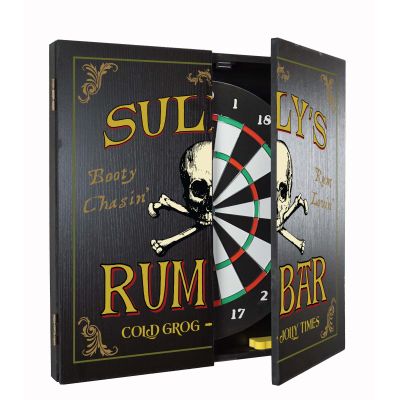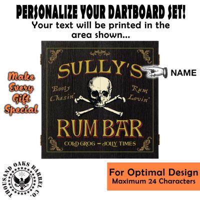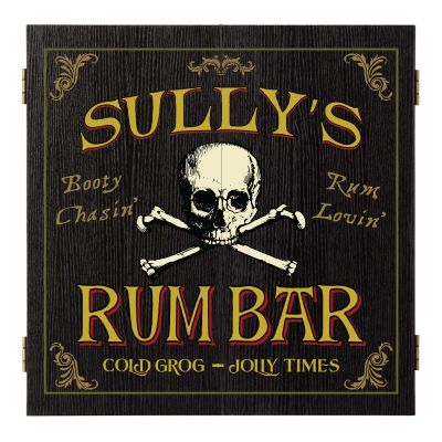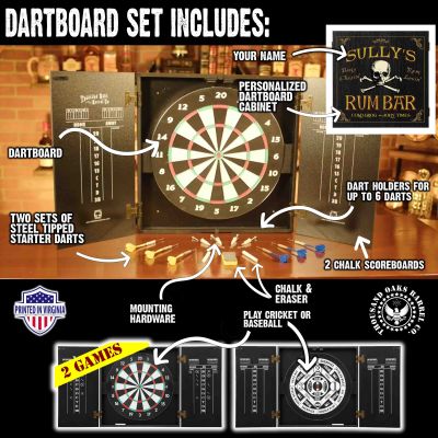 Personalized dartboard and cabinet set! This personalized cabinet will complete the look of any game room with a classic matte black traditional finish with a personalized graphic. Don't leave your wall unprotected from errant throws! The cabinet has a coated finish meant to absorb the toughest of impacts. The sharp, sleek design will complement most decors and will ensure that your dartboard doesn't clash with your style.