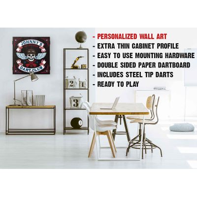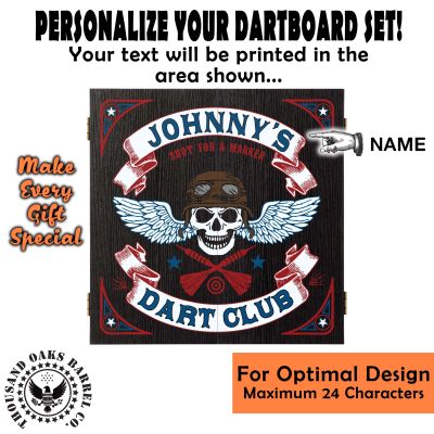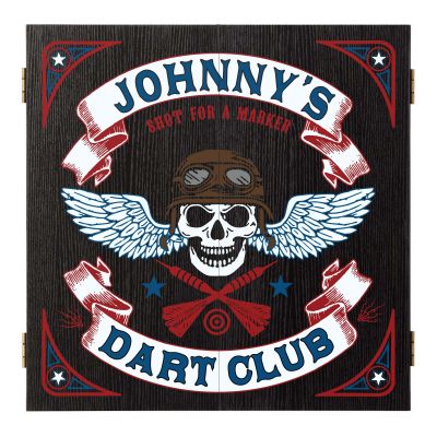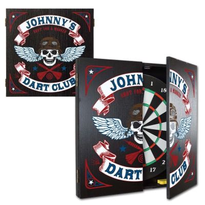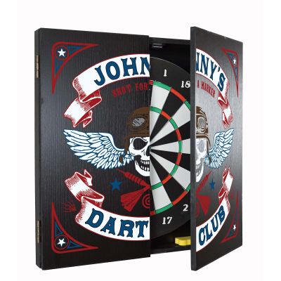 Personalized dartboard and cabinet set! This personalized cabinet will complete the look of any game room with a classic matte black traditional finish with a personalized graphic. Don't leave your wall unprotected from errant throws! The cabinet has a coated finish meant to absorb the toughest of impacts. The sharp, sleek design will complement most decors and will ensure that your dartboard doesn't clash with your style.