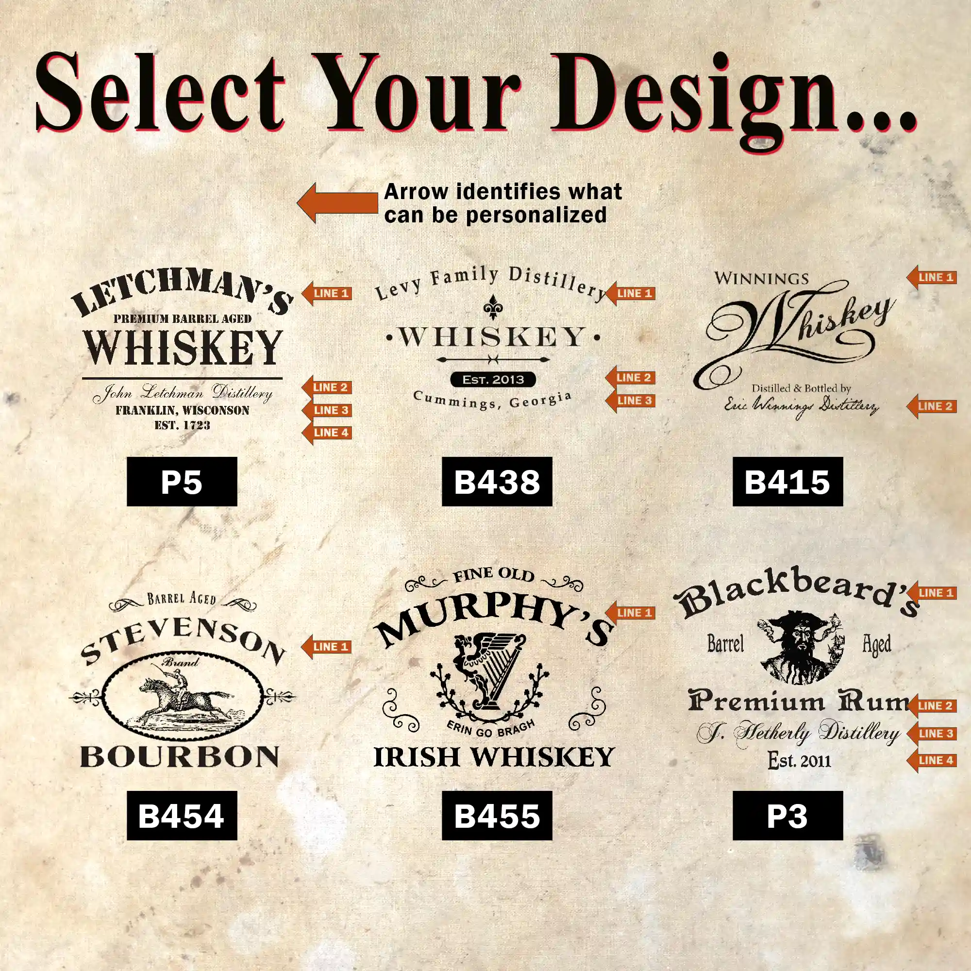 This personalized Lazy Susan features six unique vintage distillery-style engraving designs, each inspired by classic whiskey, bourbon, rum, and distillery barrel stamps.