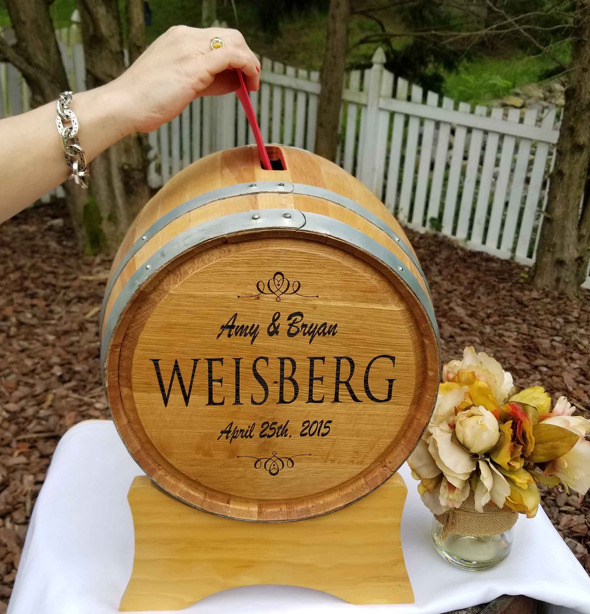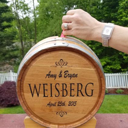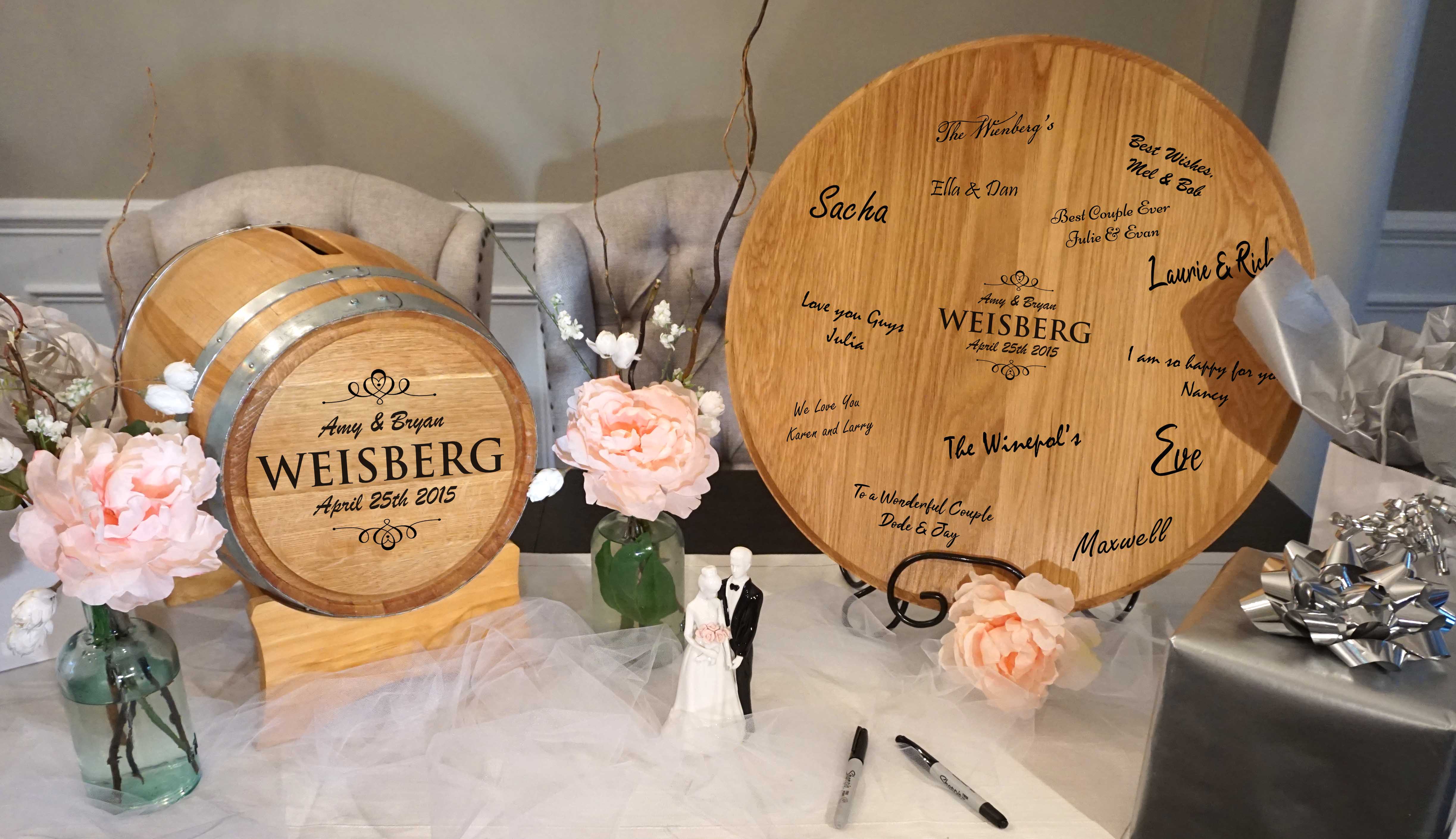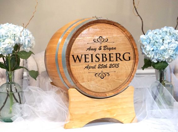 These special barrels are engraved to your specifications and and have an opening at the top for guests to place their cards, cash, bonds, or stock certificates (your choice of course).