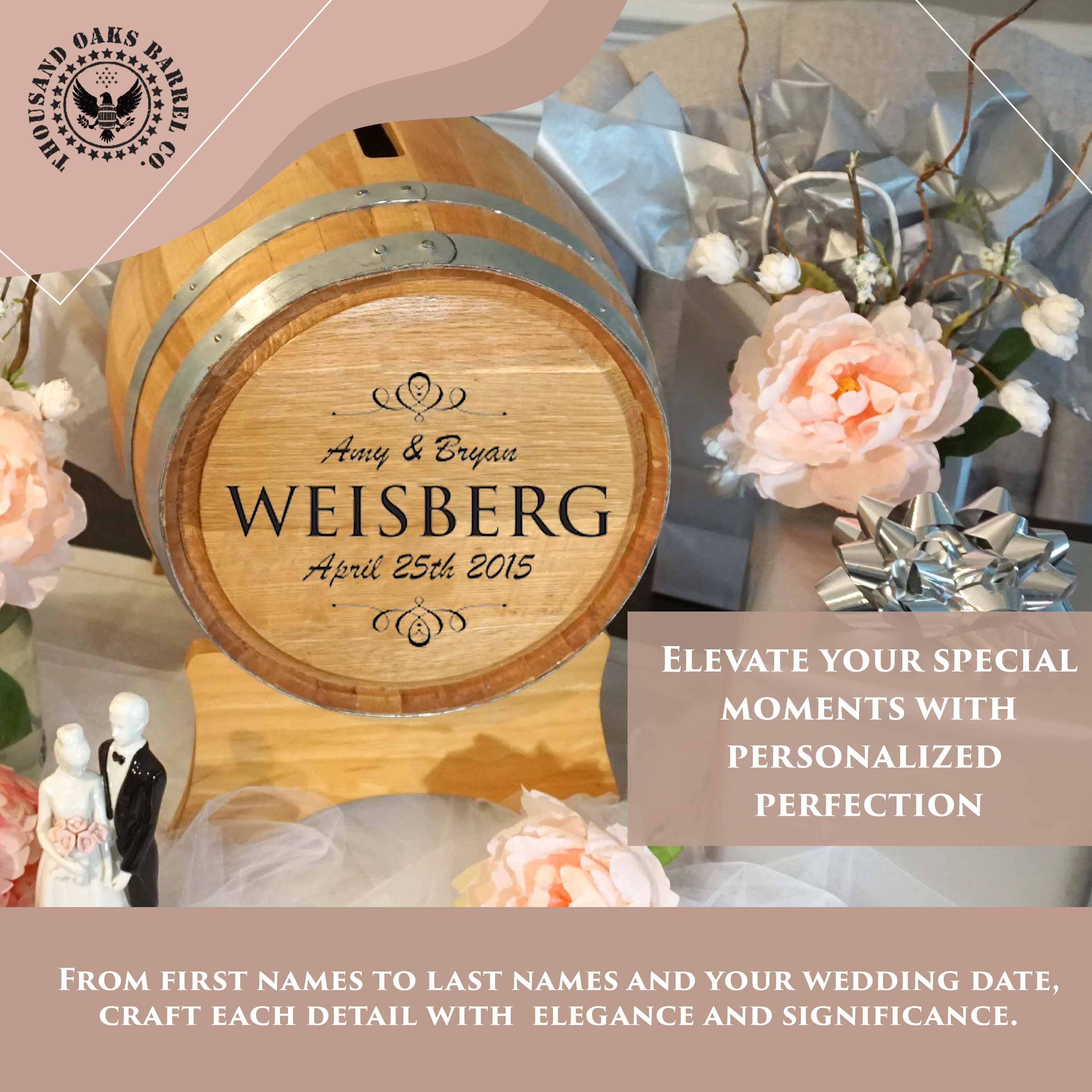 Crafted from premium oak wood, this unique barrel-shaped card holder combines timeless craftsmanship with elegant personalization. The front barrel head is custom engraved with the couple’s names and wedding date, transforming it into a meaningful keepsake long after the celebration ends.