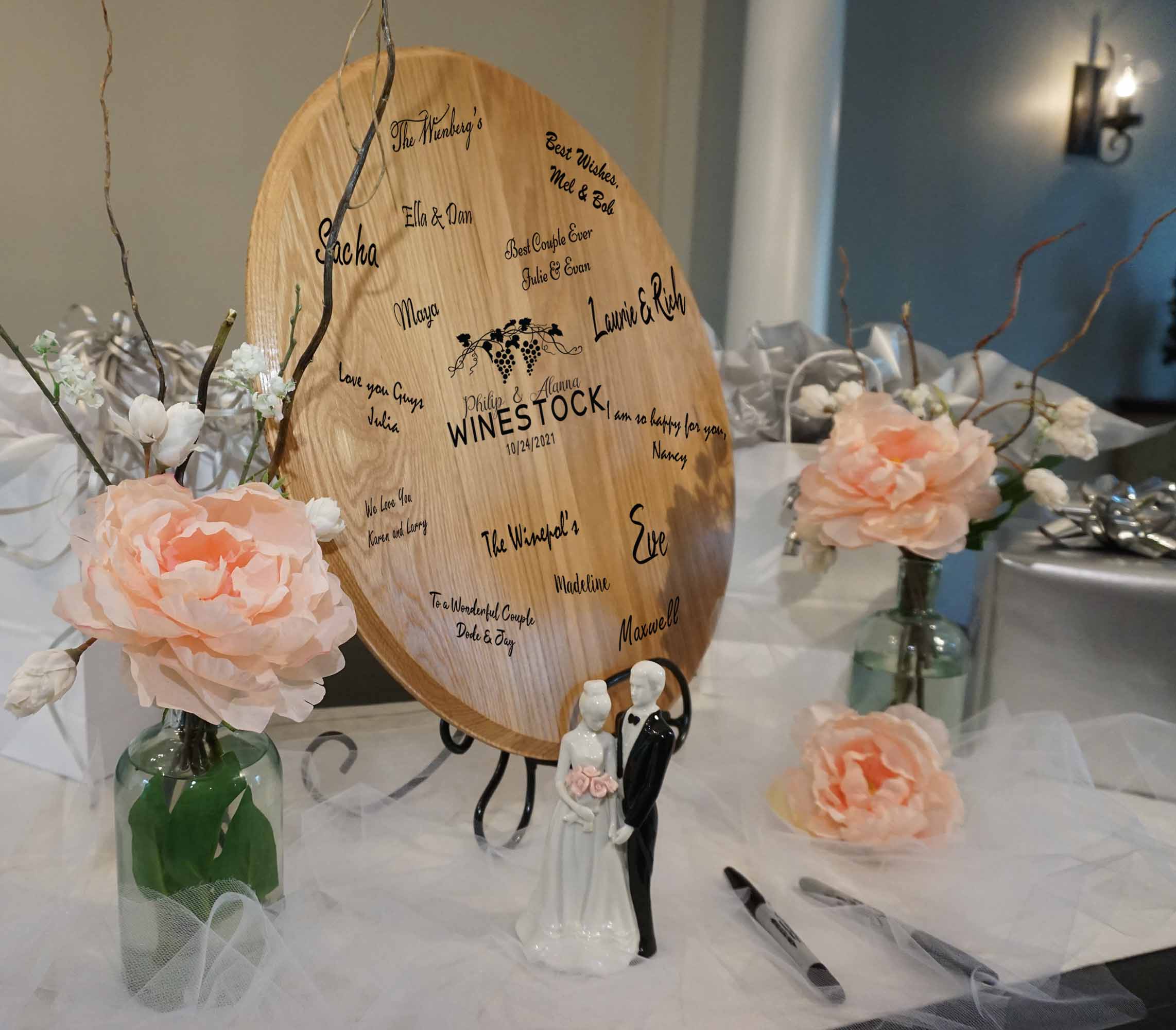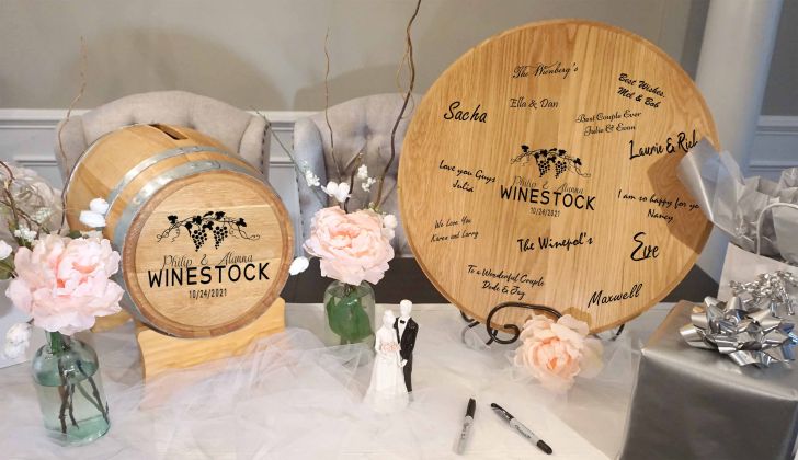 - CELEBRATE IN STYLE with a Thousand Oaks Barrel Co. Signature Wedding Barrel head. Made from a real wine barrel or whiskey barrel, this signature cask head is the perfect centerpiece for your vineyard theme wedding day ceremony. It's one of the wedding decorations you'll want to keep forever. Cherish your memories for years after the event. Encourage your guests to write their sweet nothings to make this adorable keepsake super special.