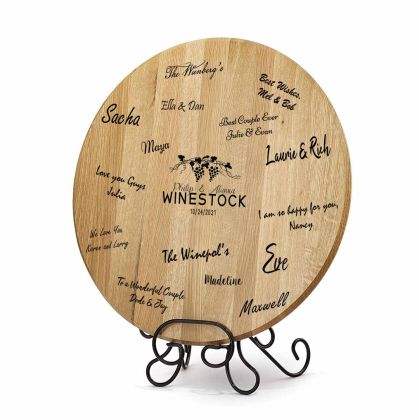 Liven up your wedding with a Thousand Oaks Barrel Co. Signature Barrel End. These special barrels heads are made from wine barrels or bourbon barrels and engraved to your specifications. Great for rustic weddings but beautifully finished to be the centerpiece of any table. This is NOT made from an old used whisky barrel. Have your guest sign this authentic barrel head. This Signature barrel comes complete with the wrought iron stand and will be the perfect decor for your vineyard wedding. After the wedding display it on the stand or hang in on your wall.