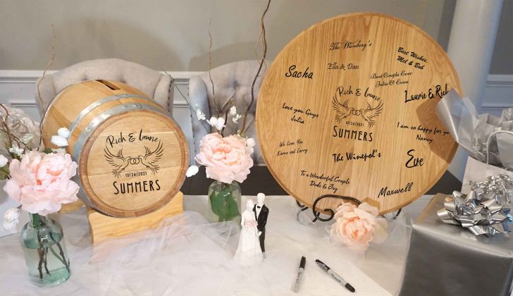 • CELEBRATE IN STYLE with a Thousand Oaks Barrel Co. Signature Wedding Barrel head. Made from a real wine barrel or whiskey barrel, this signature cask head is the perfect centerpiece for your vineyard theme wedding day ceremony. It's one of the wedding decorations you'll want to keep forever. Cherish your memories for years after the event. Encourage your guests to write their sweet nothings to make this adorable keepsake super special.