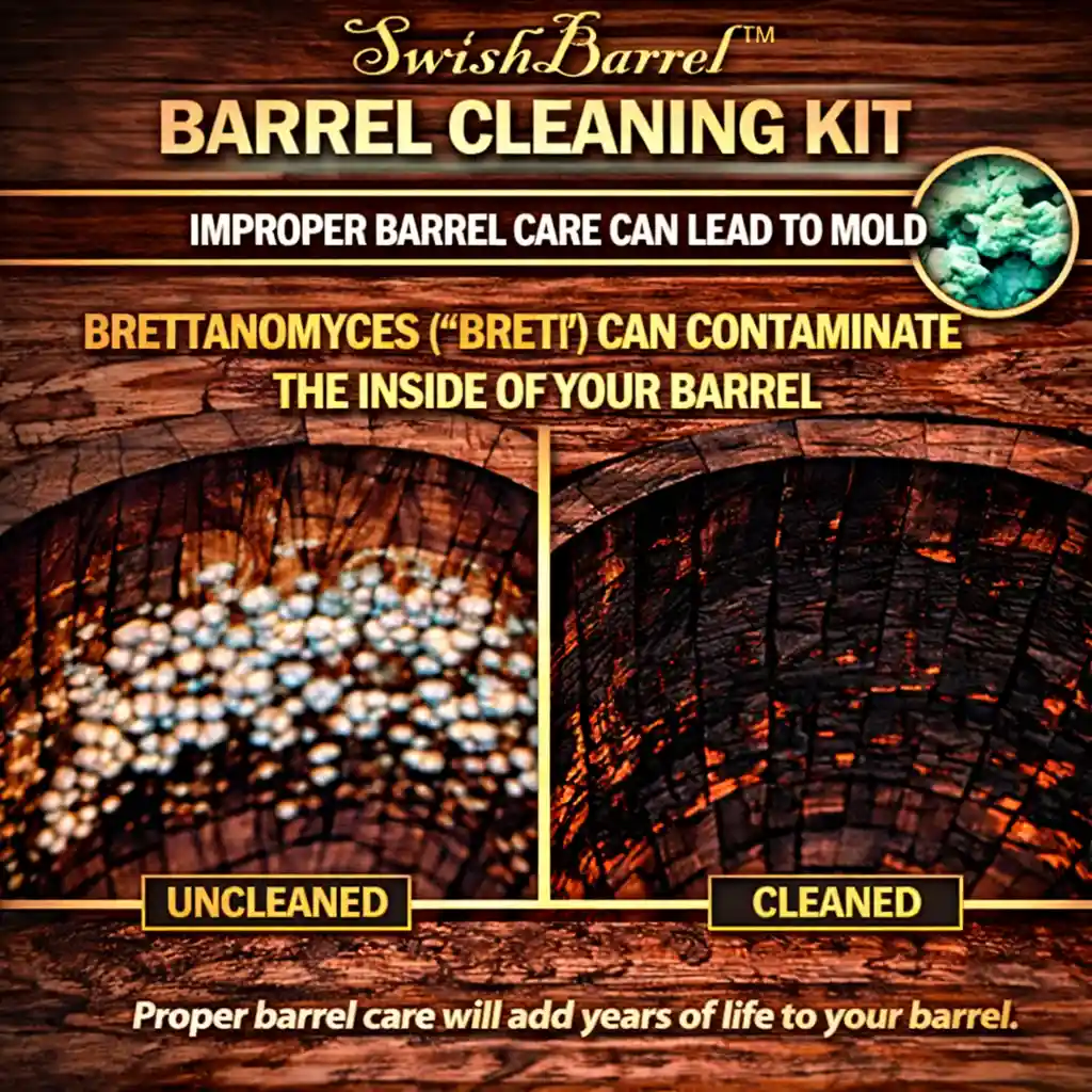 Proper barrel maintenance is essential for extending the life of your investment. Without routine cleaning, barrels can develop off-flavors, bacteria, or even brettanomyces (“brett”) contamination, which can ruin future batches. This kit helps protect your barrel from mold and contamination, allowing you to safely reuse your barrel for multiple aging cycles.