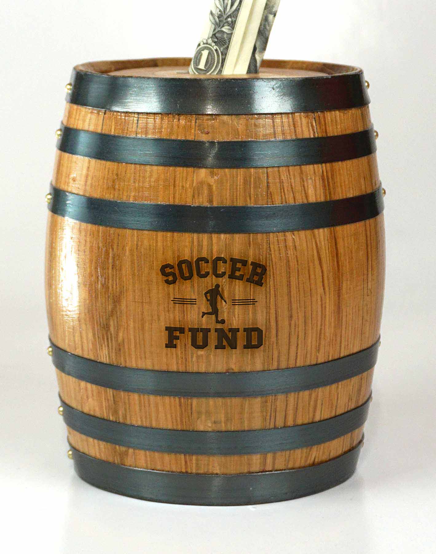 'Soccer Fund' Mini Oak Barrel Bank (PB115)