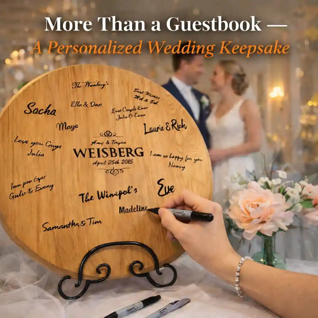Guests sign the engraved wooden signature board with their names or heartfelt messages.