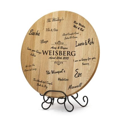 Liven up your wedding with a Thousand Oaks Barrel Co. Signature Barrel End. These special barrels heads are made from wine barrels or bourbon barrels and engraved to your specifications. Great for rustic weddings but beautifully finished to be the centerpiece of any table. This is NOT made from an old used whisky barrel. Have your guest sign this authentic barrel head. This Signature barrel comes complete with the wrought iron stand and will be the perfect decor for your vineyard wedding. After the wedding display it on the stand or hang in on your wall.