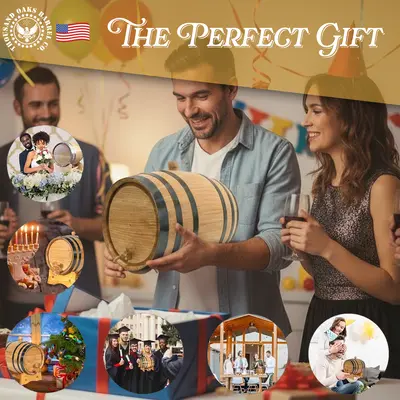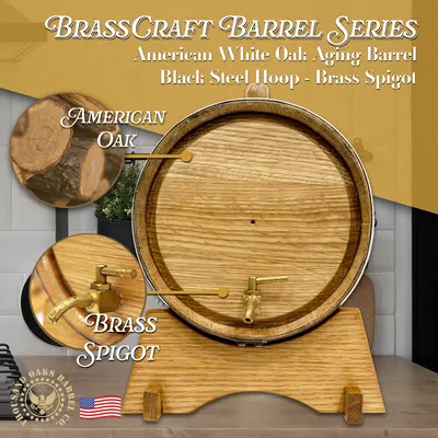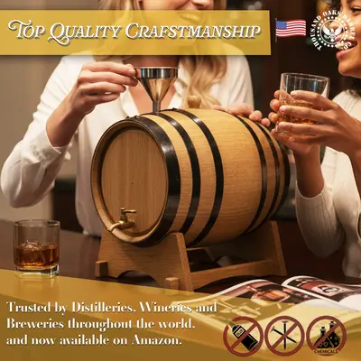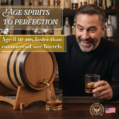 Discover the perfect addition to your home bar with our mini charred oak barrel with a brass spigot, crafted from premium American oak for rich, authentic aging. This mini oak barrel features a deeply charred interior that enhances whiskey, bourbon, rum, tequila, wine, and cocktails with smooth flavor and deep color. Each small charred oak whiskey barrel comes complete with a sturdy wooden stand, a tight-seal bung, and a polished brass spigot for easy, controlled pouring. Ideal as a 2-liter oak aging barrel or tabletop oak barrel dispenser, it’s leak-tested and ready for immediate use. To help you master the aging process, every barrel includes the 28-page Bootlegger’s Bible, filled with tips, recipes, and step-by-step guidance. Whether used for home aging, bar décor, or gifting, this mini oak aging barrel offers professional-quality results and classic charm in a compact size.