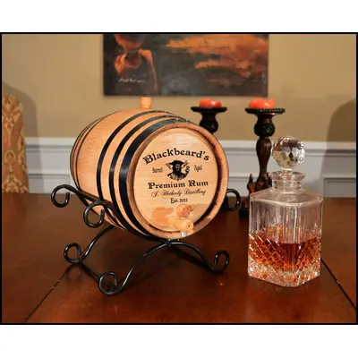 Custom Laser inscribed handcrafted American White Oak barrel with design. Barrels have a medium char and come with the stand, bung, wooden spigot and storing tablet.