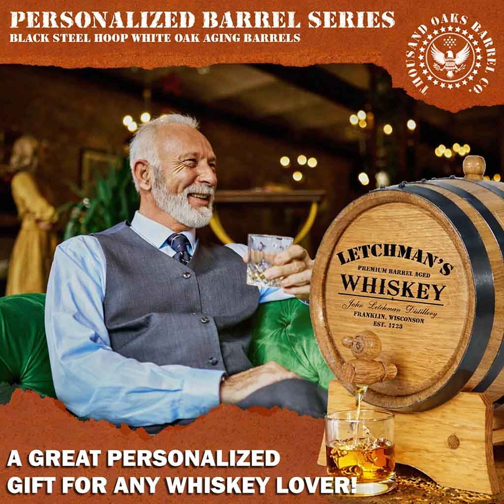 Each barrel features a classic whiskey distillery design and can be personalized with: